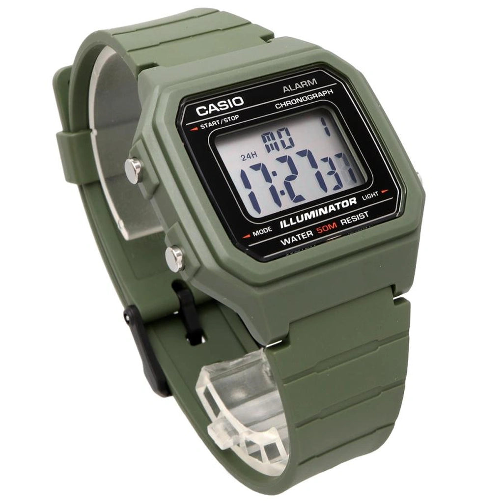 Il Casio W-217H-3AVES, conosciuto anche come W-217-3A, è un orologio digitale dal look militare-urban, ideale per chi cerca uno stile deciso e minimal, abbinato alla semplicità e robustezza dei classici digitali Casio. Con un design compatto e quadrante in stile retrò anni ’80, è perfetto per l’uso quotidiano, sportivo o urbano.